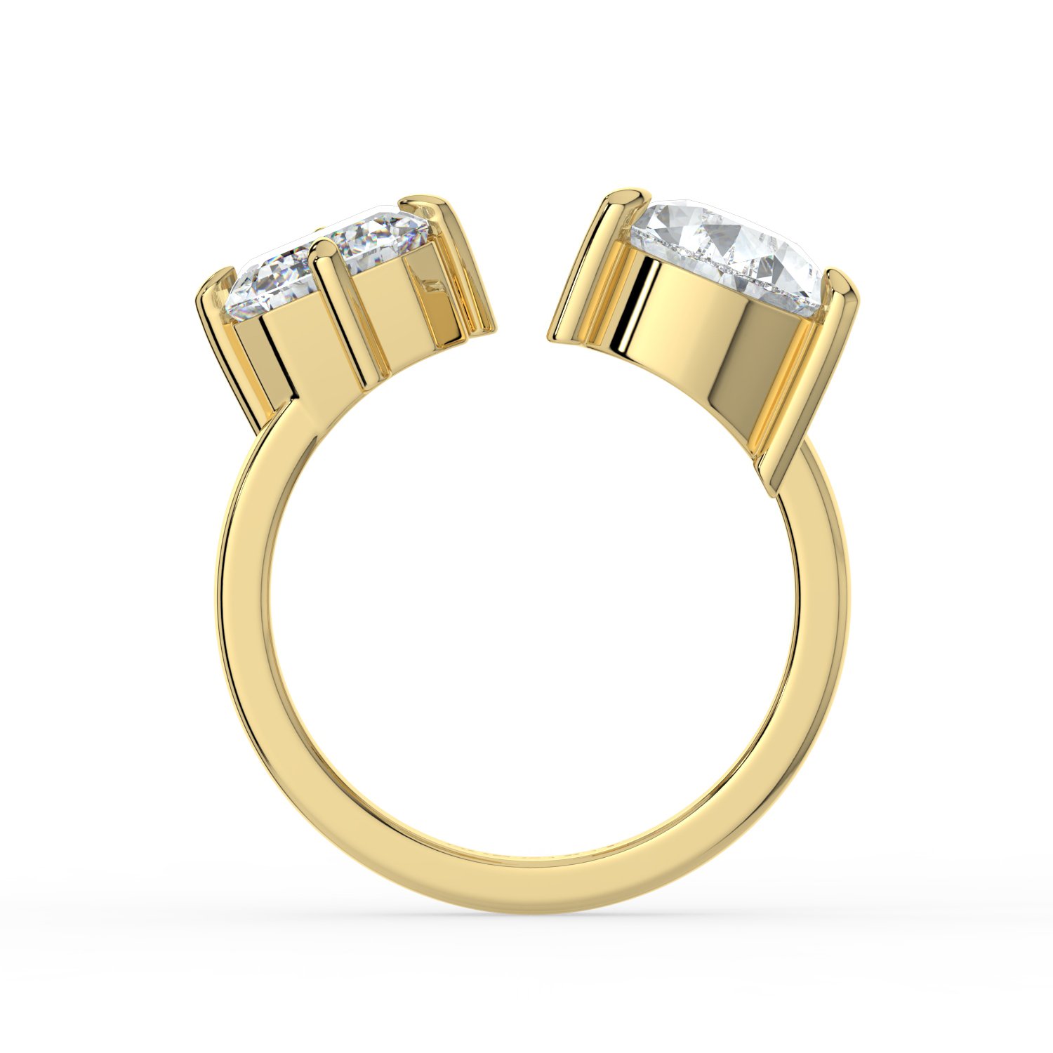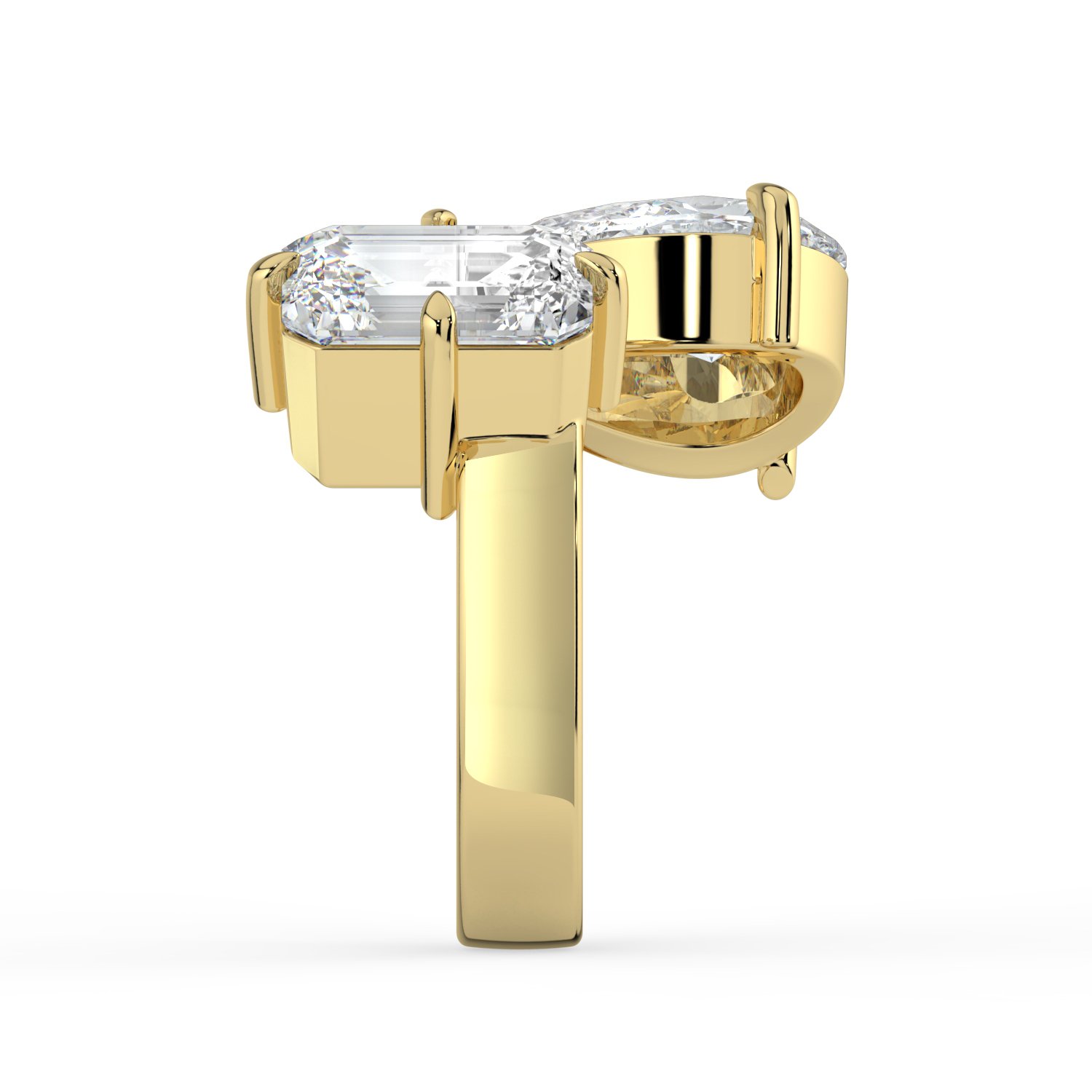 A striking modern design, this open diamond ring from ONE CARAT showcases the brilliance of two exceptional lab grown diamonds a sleek emerald-cut and a radiant pear-cut, set in luminous 18K yellow gold. The open band creates a contemporary silhouette, symbolizing individuality and duality in perfect harmony. Ideal for making a statement, this ring blends bold style with timeless elegance, perfect for anniversaries, luxury occasions, or a statement jewelry gift.