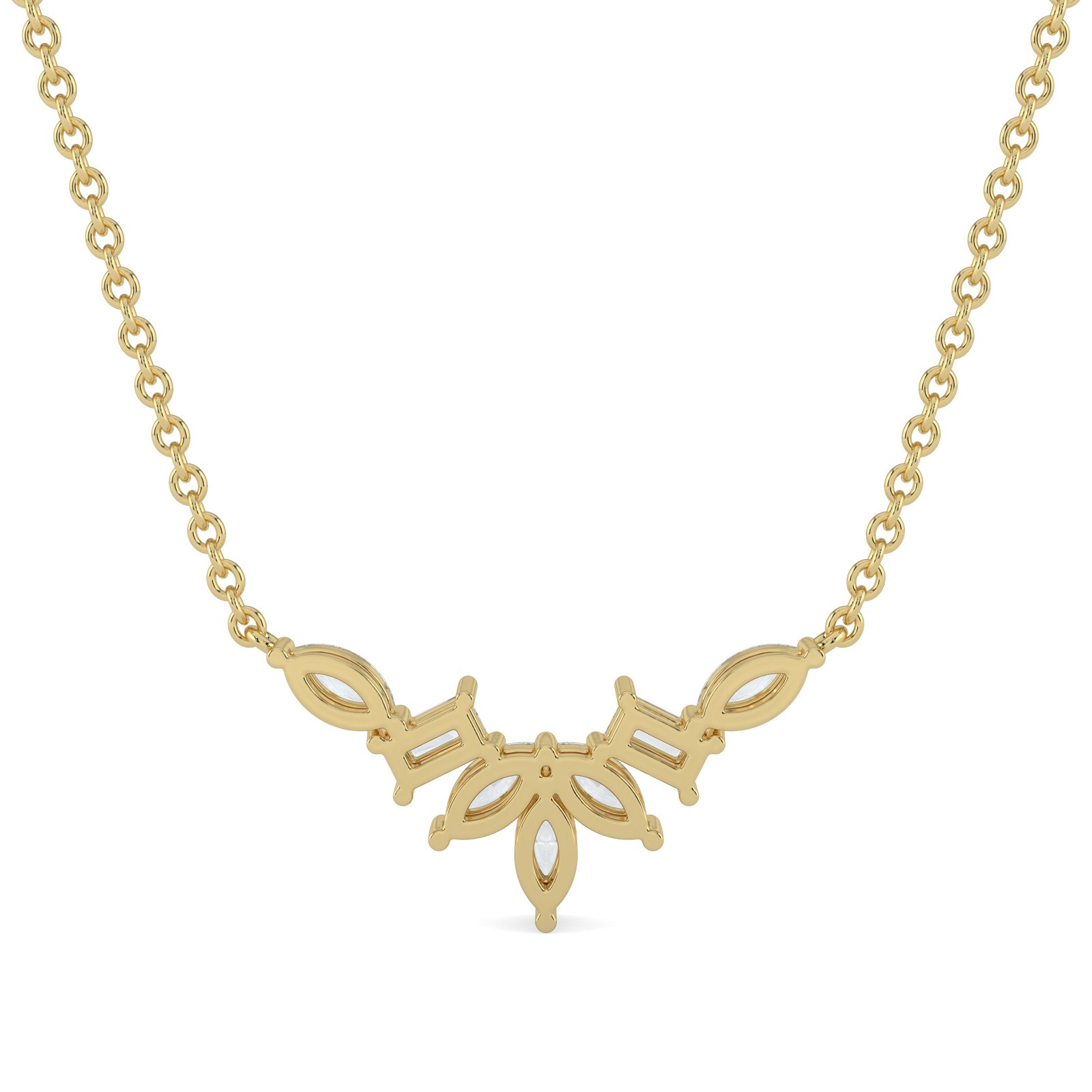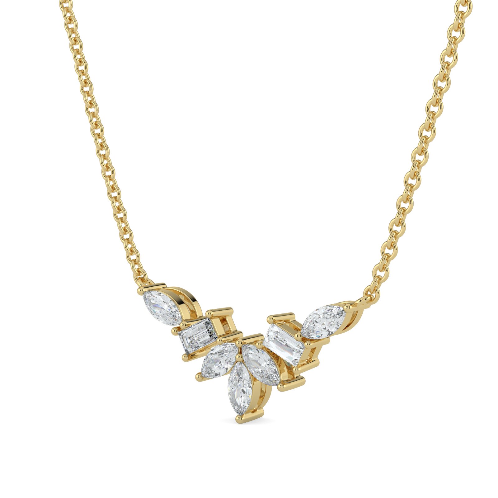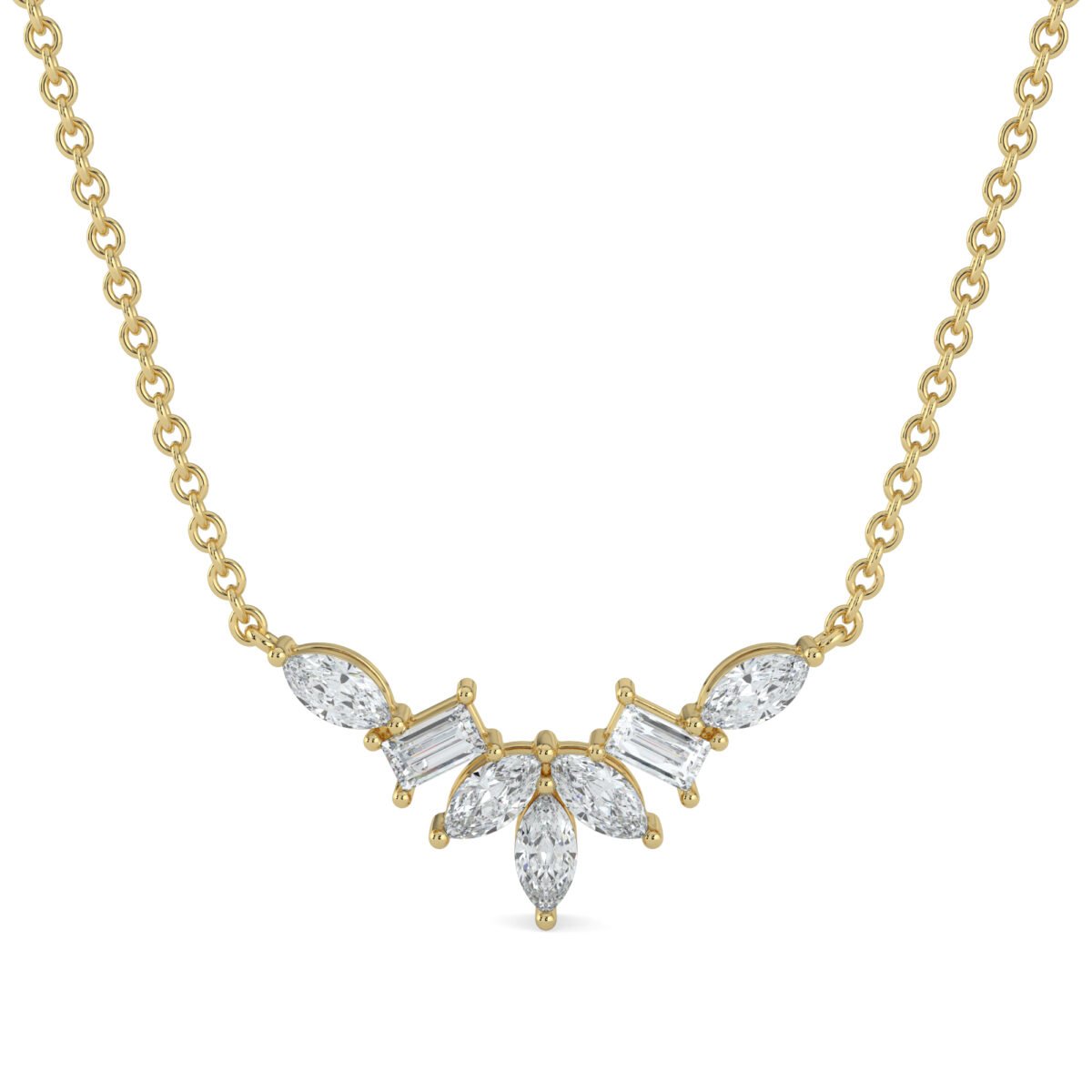 A graceful fusion of timeless elegance and modern design, this necklace features marquise and baguette-cut diamonds set in luxurious 18K yellow gold. The delicate arrangement creates a radiant centerpiece, making it perfect for special occasions or as a refined everyday statement piece.