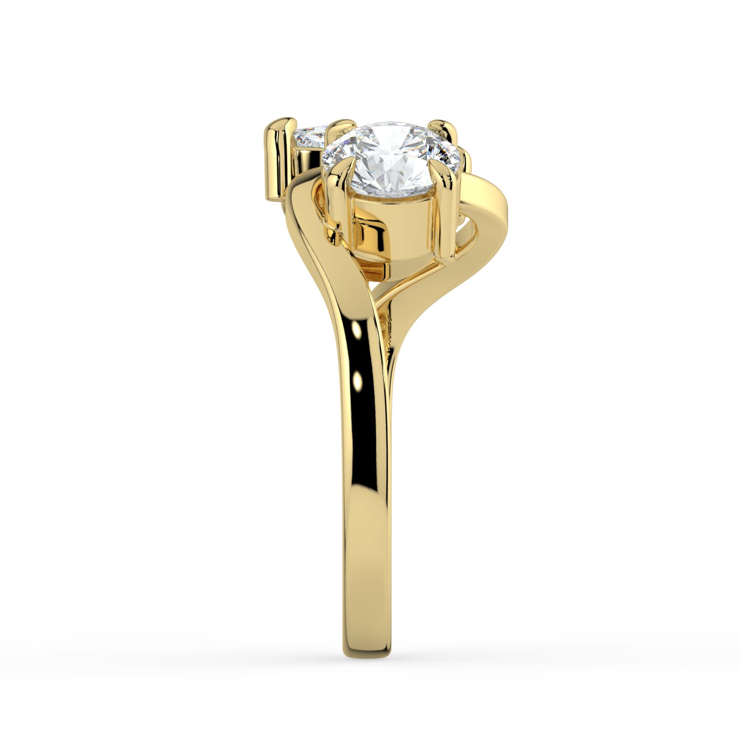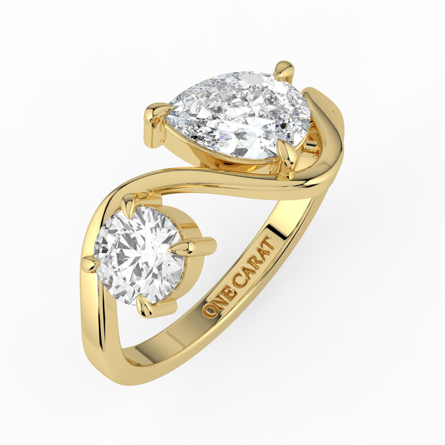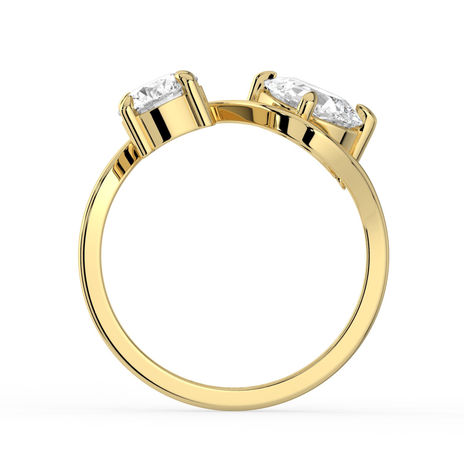 This elegant bypass ring showcases two dazzling diamonds — a brilliant round-cut and a graceful pear-cut — set in polished 18K yellow gold. The unique bypass design symbolizes the union of two souls, making it a romantic and meaningful choice. With its modern yet timeless appeal, this ring is perfect for engagements, anniversaries, or as a statement of everlasting love.