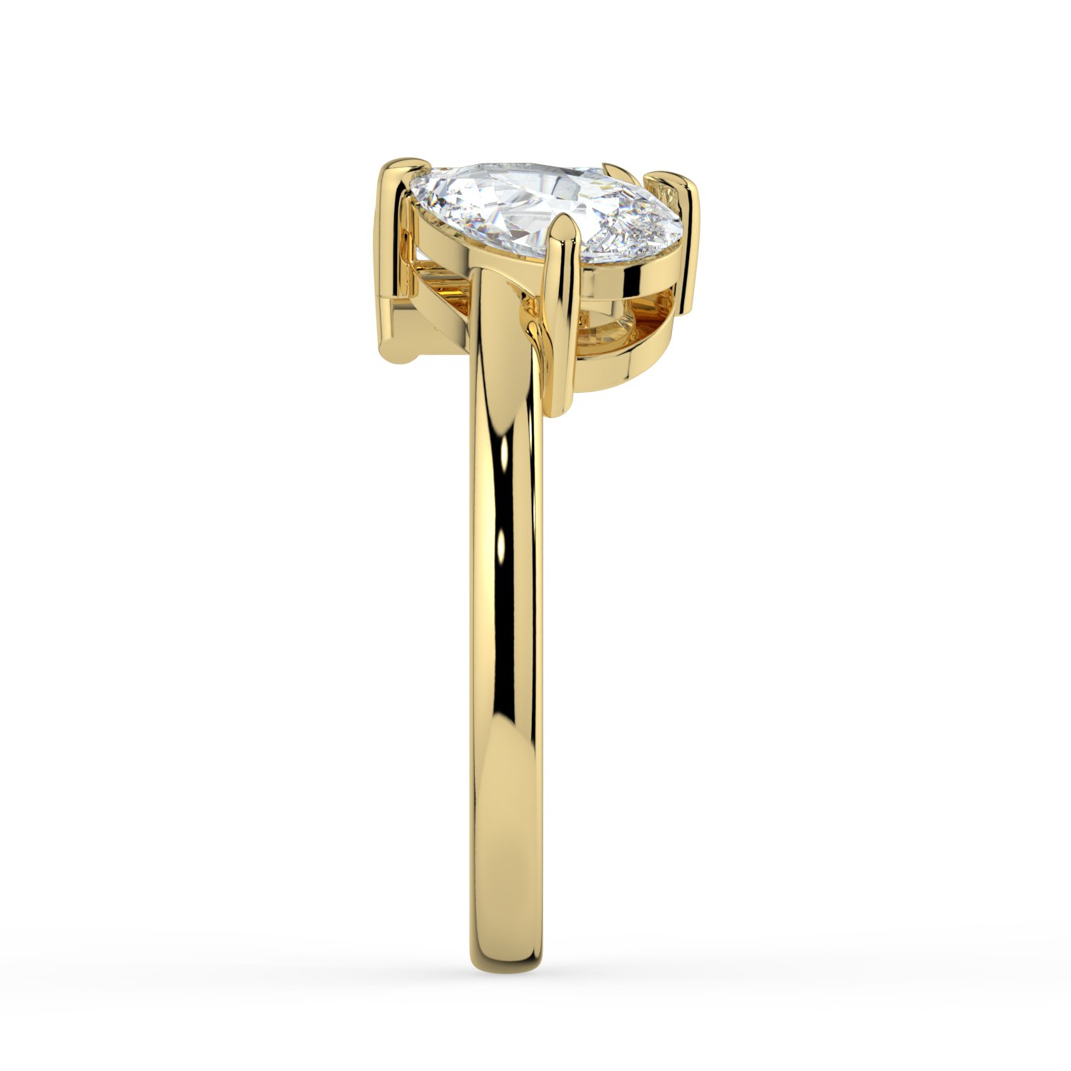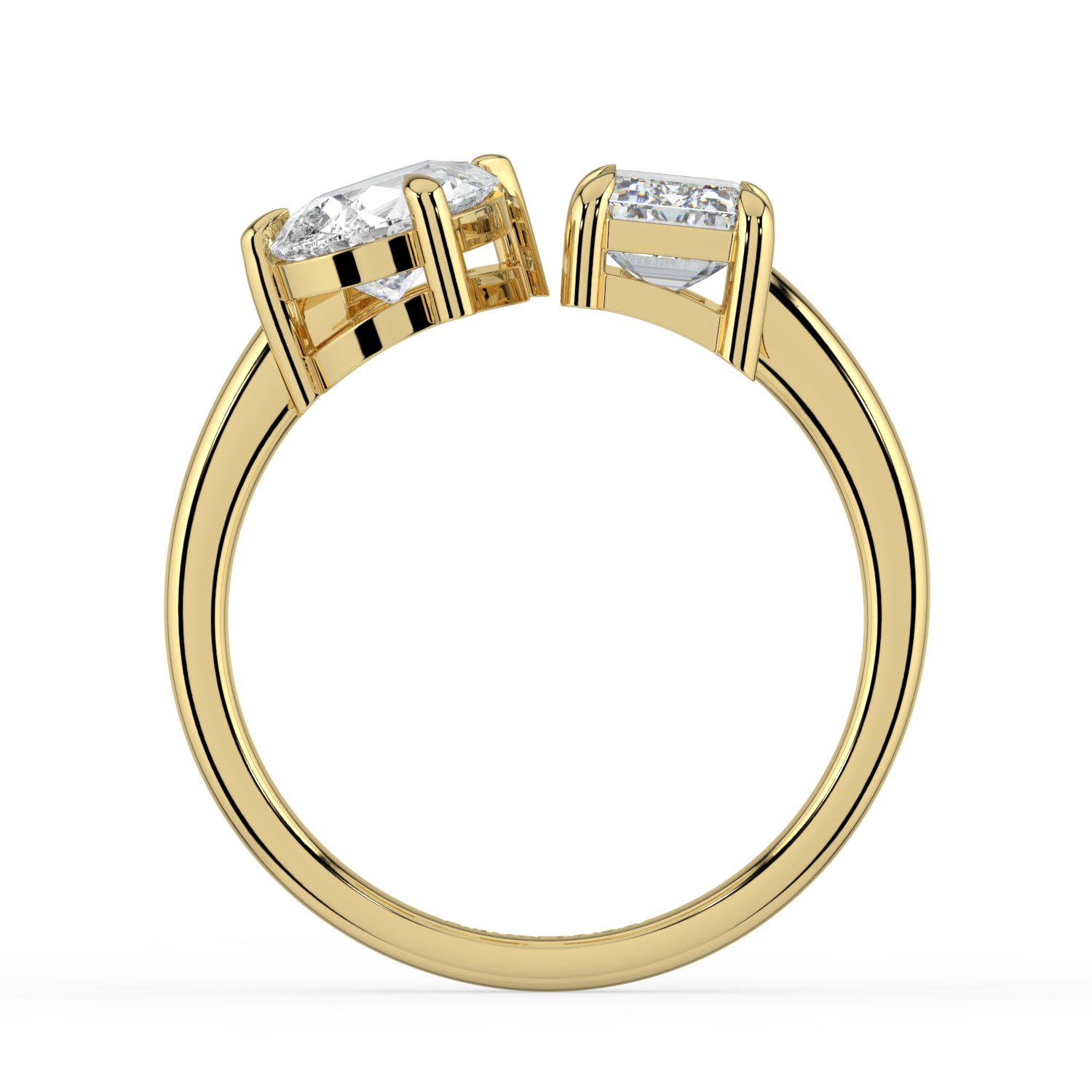 An elegant fusion of contrasts, this two-stone diamond ring pairs a sleek emerald-cut diamond with a brilliant pear-cut diamond, set in polished 18K yellow gold. The asymmetric yet balanced design symbolizes harmony and duality, making it a striking choice for engagements, anniversaries, or a bold everyday statement. A modern masterpiece that combines sophistication with timeless charm.