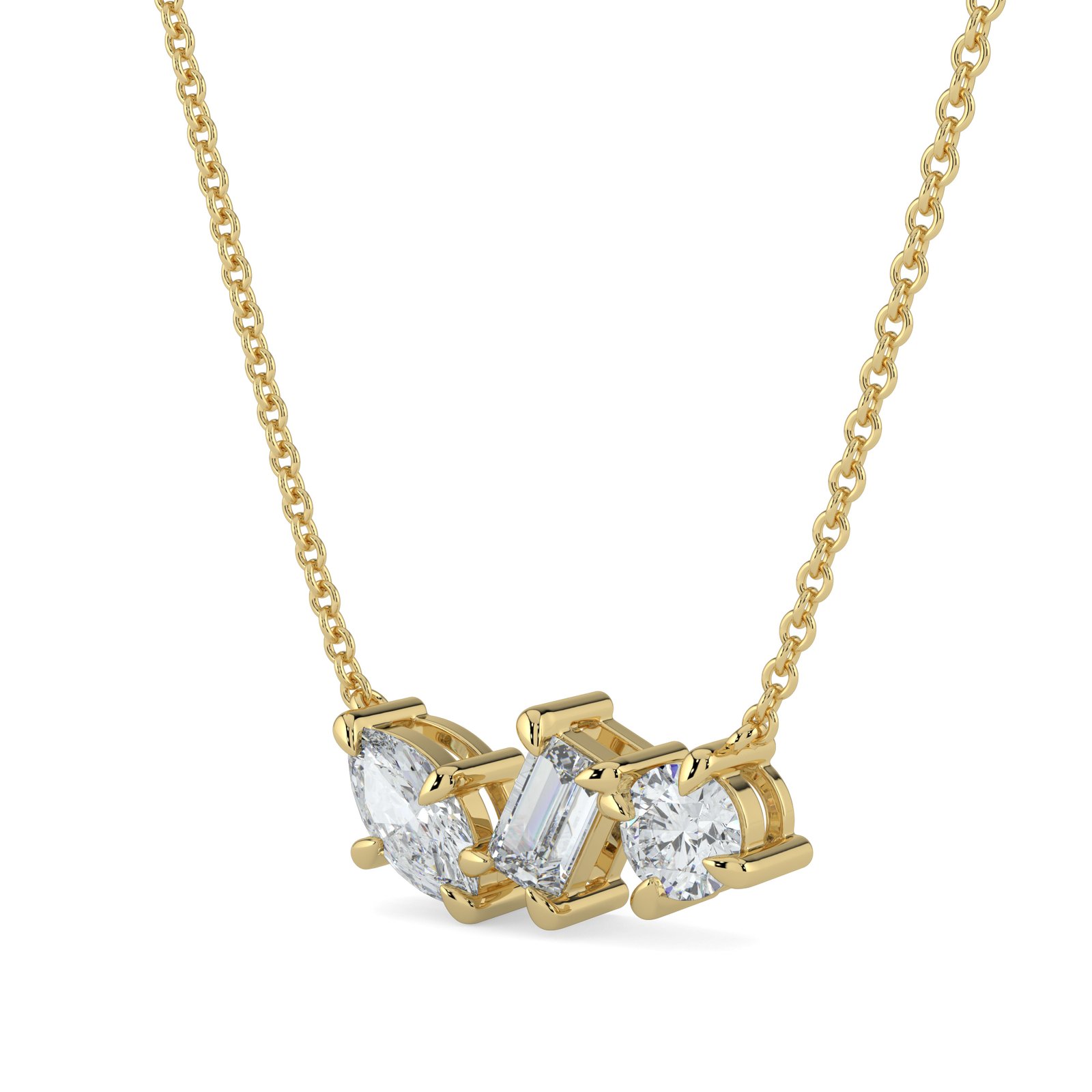 Discover timeless elegance with the One Carat Trio Brilliance Diamond Necklace. Expertly crafted in luxurious 18K gold, this necklace showcases three dazzling Lab Grown diamonds in unique cuts a brilliant marquise, a sleek baguette, and a classic round. Their harmonious blend creates a playful yet sophisticated design, suspended gracefully from a delicate gold chain.